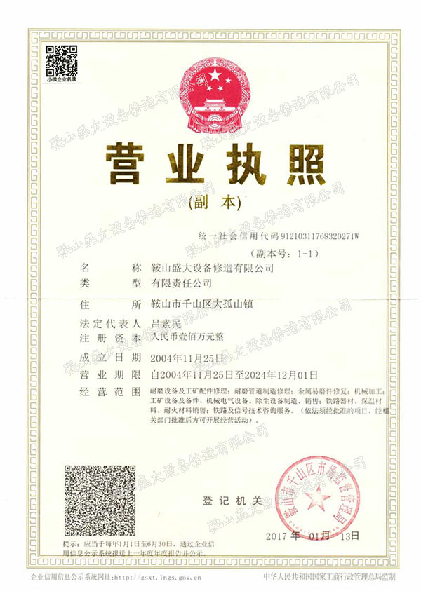 鞍山盛大設(shè)備修造有限公司位于鞍山市千山區(qū)大孤山鎮(zhèn)。堅(jiān)持以“卓越的產(chǎn)品性能、安全的質(zhì)量保證、良好的售后服務(wù)”為企業(yè)發(fā)展理念,為客戶提供滿意的服務(wù)。隨著公司的進(jìn)一步發(fā)展壯大,作為礦業(yè)企業(yè)節(jié)支增收的好幫手,秉承“你給我一個機(jī)會,我還你一份貢獻(xiàn)”的經(jīng)營思路,努力為礦山企業(yè)的發(fā)展多做貢獻(xiàn)。